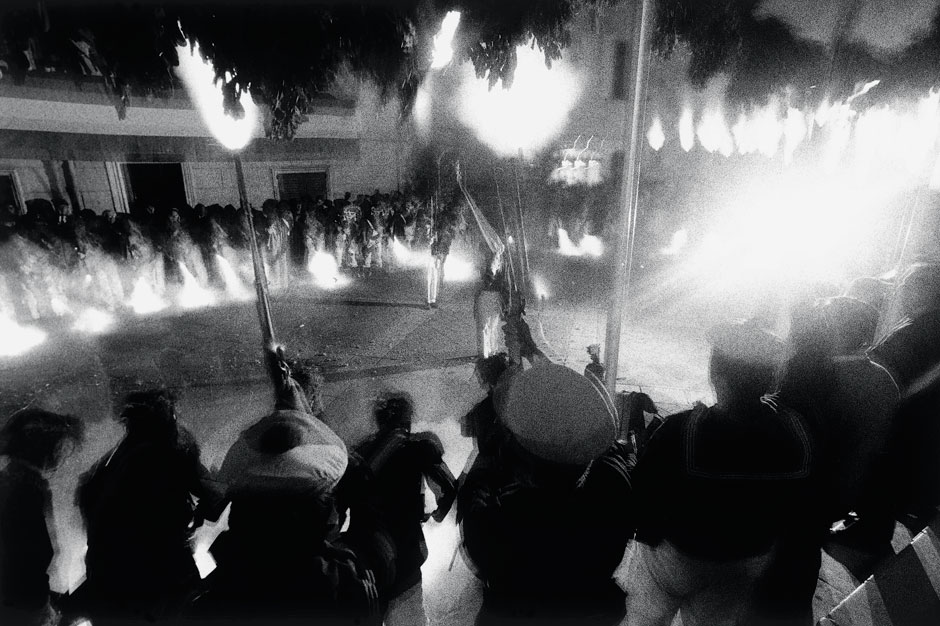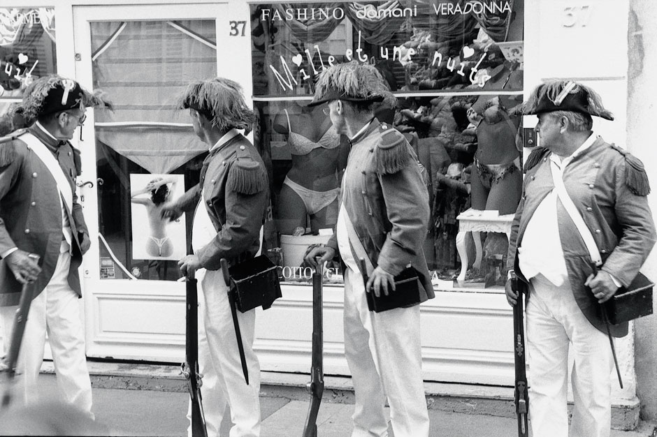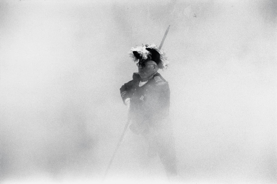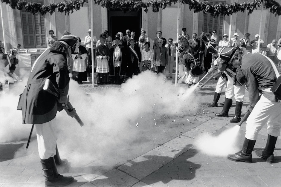 Fascinée par cette sacralisation du réel inhérente à tout rituel, en particulier dans ses manifestations les plus populaires et fétichistes, Géraldine Langlois s’était déjà intéressée à la Semaine Sainte de Séville. Elle aime, dans chacun de ses reportages, se glisser dans les situations les plus dynamiques, photographiant comme filmerait un cinéaste caméra à l’épaule. D’ailleurs, le cadre, à l’image d’un travelling vertical, descend et remonte sans cesse, avant de se fixer sur des scènes voire des natures mortes plus statiques et frontales. Les images sont parfois tremblées, sinon troublées par ce qui ressemble à un précipité dans la clarté du réel – des flous de bougé qui sont l’une des spécificités du médium -, ou encore des perturbations extérieures à celui-ci, comme cette fumée due aux salves inoffensives déchargées sur le sol. Les soldats occasionnels de la « Bravade » créent des écrans évanescents qui dissimulent autant qu’ils révèlent. Figé dans un rituel immuable, un homme coiffé d’un bicorne surgit d’un nuage blanc qui ressemble à un brouillard matinal. Apparition insolite, cet homme semble braver le temps. Rendant hommage à ses lointains ancêtres génois, il perpétue un rite dont le nom est justement d’origine italienne (c’est un emprunt à l’italien bravata) : « faire le brave », c’est-à-dire être en faisant semblant, non pas faire semblant d’être, mais atteindre à l’être en faisant semblant. Cela pourrait bien être aussi une définition possible de l’art, et pas seulement photographique. Ou simplement de l’existence.